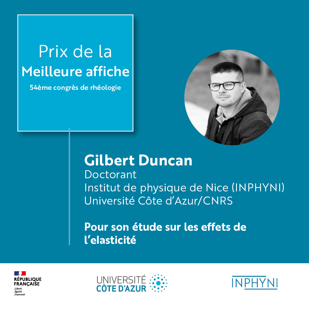 Un grand bravo à ce dernier, ainsi qu'à toute l'équipe du laboratoire INPHYNI.Prix de la meilleure affiche - 54ème Congrès du Groupe Français de Rhéologie