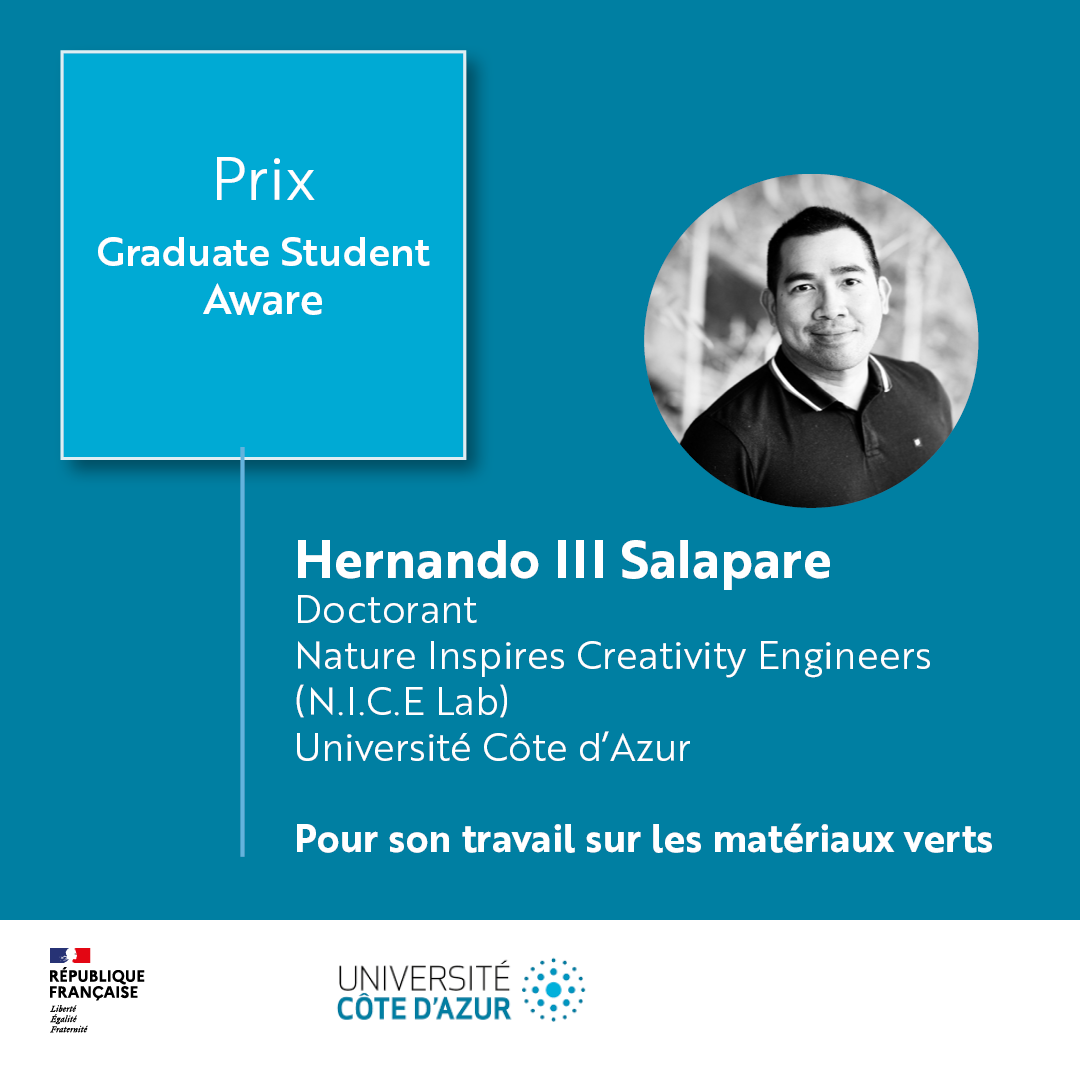 année de doctorat. La thèse fait partie du projet de recherche intitulé « Bioinspired Oleophobic Self-Cleaning Surfaces for Automotive Interior Environment », réalisé en collaboration entre N.I.C.E. Lab - Université Côte d’Azur, Université de Pau et des Pays de l’Adour, Renault et Faurecia.Prix Graduate Student - Hernando III Salapare